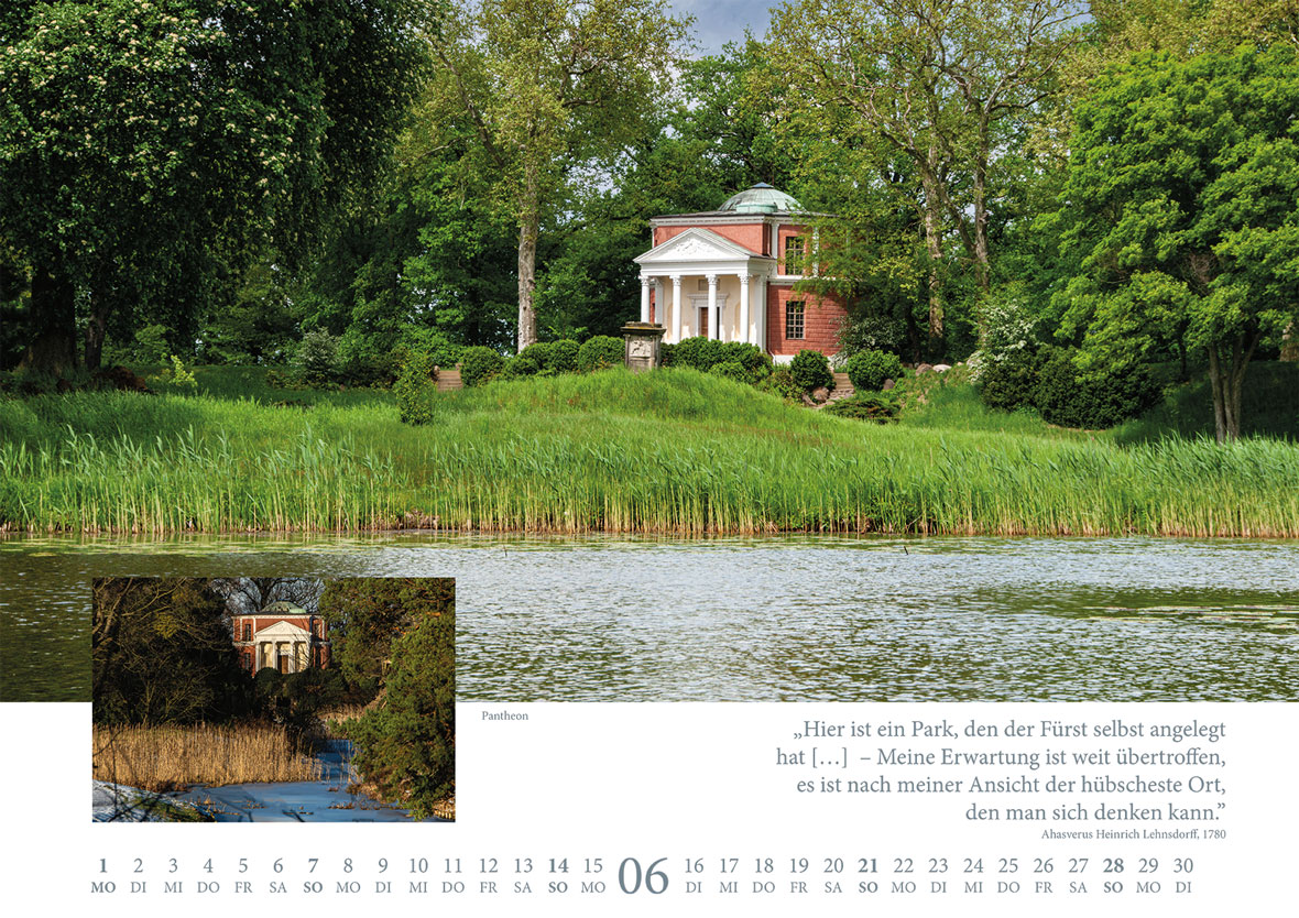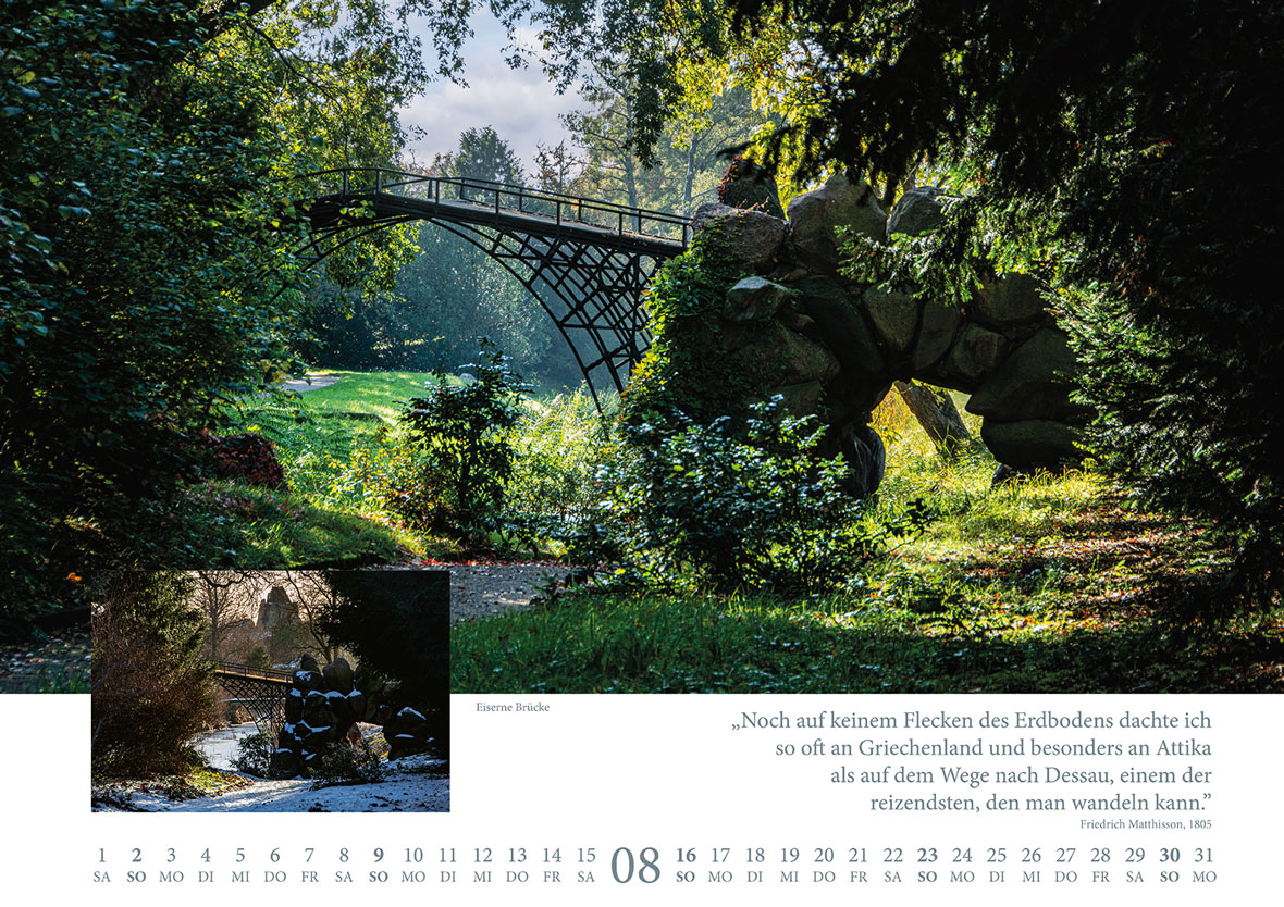 Überraschende Perspektiven und Einblicke in den einzigartigen Wörlitzer Park, gepaart mit Zitaten von Freunden und Zeitgenossen des Gartenreichschöpfers Leopold III. Friedrich Franz von Anhalt-Dessau (1740-1817), die ihre Eindrücke in leidenschaftlichen Briefen und Notizen für die Ewigkeit festgehalten haben.
